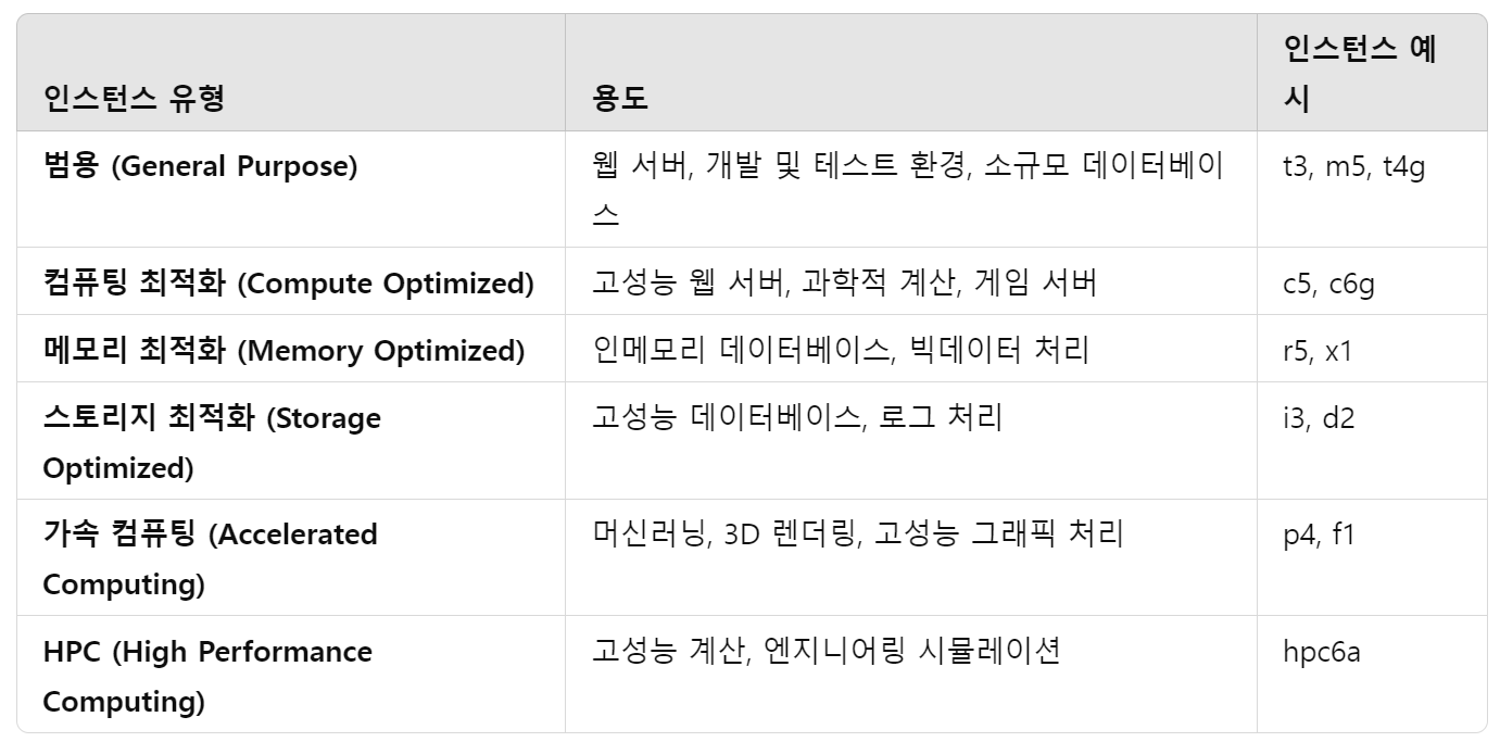 아래는 AWS에서 제공하는 주요 인스턴스 타입과 그 유형에 대한 설명입니다.