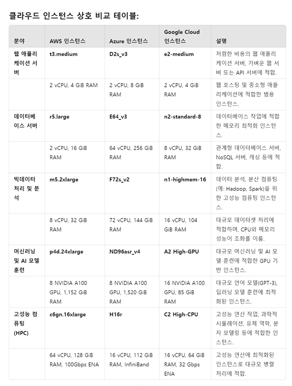아래는 AWS, Microsoft Azure, Google Cloud에서 제공하는 웹 애플리케이션 서버, 데이터베이스 서버, 빅데이터 처리 및 분석, 머신러닝 및 AI 모델 훈련, 고성능 컴퓨팅 분야에서 각각 추천되는 인스턴스들을 비교한 자료입니다.
