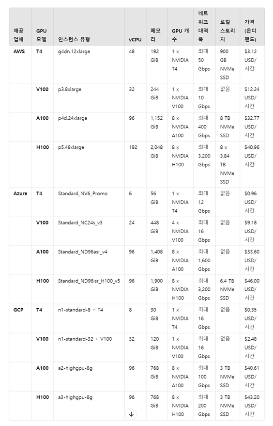 - 장점: 매우 강력한 성능으로 AI 모델 학습 및 추론, HPC 작업까지 처리할 수 있으며, 대규모 연산 작업에 적합합니다.